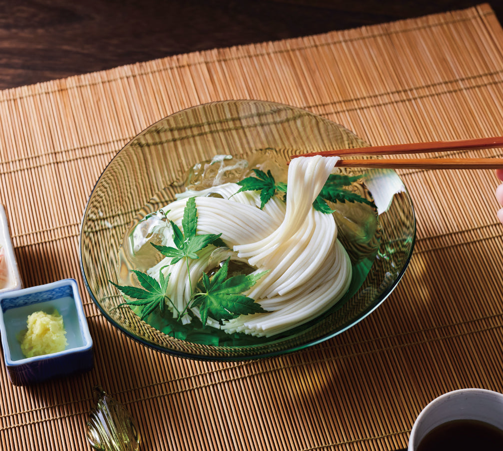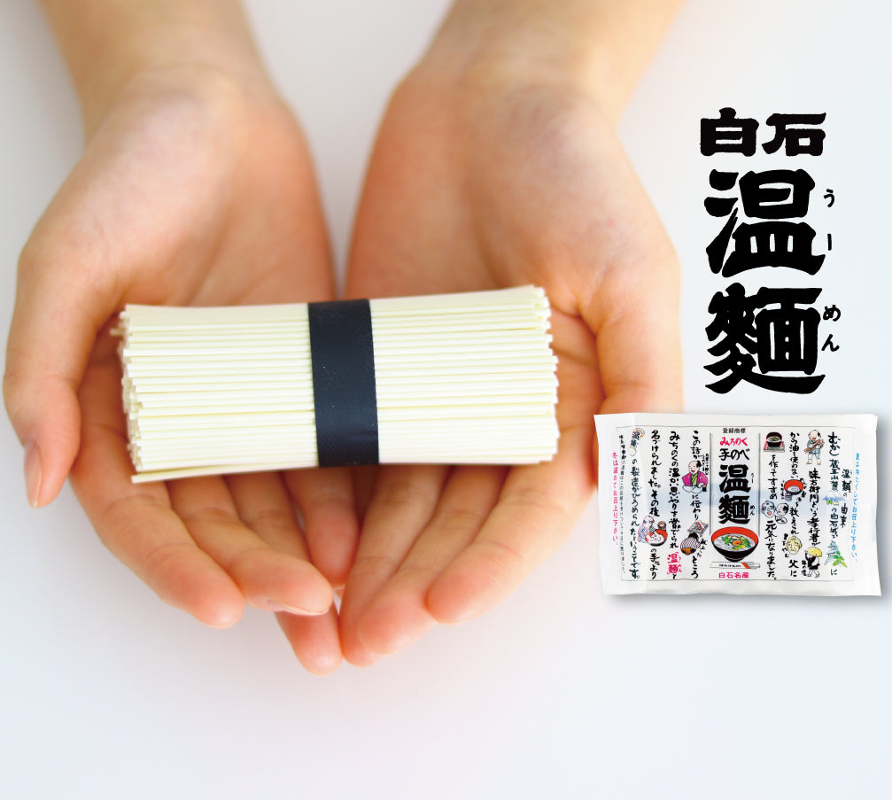 白石温麺(しろいしうーめん)は全国でも珍しく、わずか9cmの長さでちょっと太めのそうめんです。油を使わない製法でからだにやさしく、短くて食べやすいのが特徴です。